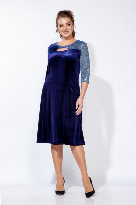 Платье женское нарядное полуприлегающего силуэта расширенное к низу, выполнено из велюра с добавлением эластана, отрезная кокетка и один рукав из контрастной ткани. Длина платья по спинке 106 см, длина рукав 45 см.