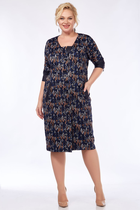 Платье женское полуприлегающего силуэта,выполнено из трикотажной ткани. Застежка центрально - бортовая на петли и пуговицы с отрезной планкой из экокожи и отрезным рукавом.На полочке обработаны функциональные карманы листочка из экокожи.
