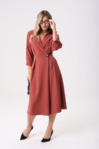 Тиньяле – платье приталенное из однотонной плательной ткани. Вырез горловины V-образный. Рукава 3/4, втачные, оторочены манжетами. На юбке декоративные встречные складки. Пояс в комплекте. На спинке – замок. Будьте яркой и стильной вместе с "