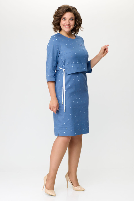 Элегантное женское платье выполнено из хлопковой ткани. Платье полуприлегающего силуэта с отрезной линией талии. Лиф выполнен в виде отлетной детали по низу. Горловина круглая, по линии талии кулиса с декоративным шнуром. По юбке в боковых швах карманы, понизу небольшие разрезы. Рукава втачные, 3/4. Платье без подкладки.