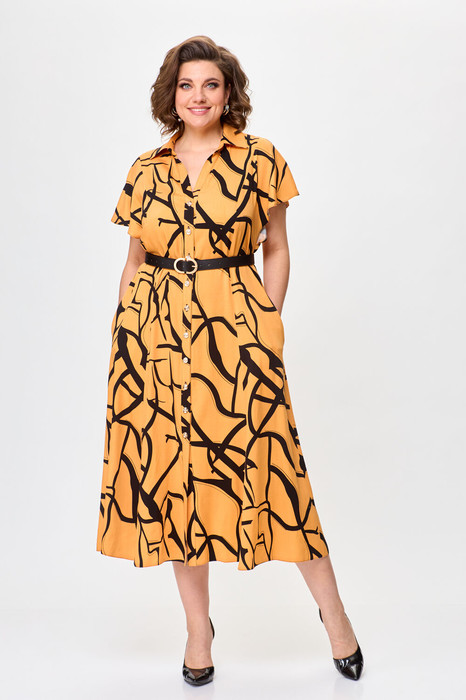 Летнее платье выполнено из легкого штапеля с принтом. Платье не отрезное по линии талии с центральной застежкой на петли-пуговицы, по переду и спинке рельефы по низу с разрезами. Платье с цельновыкроенными рукавами «крылышко».