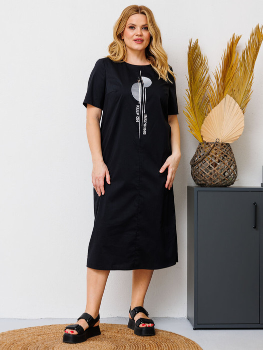 Хлопковое платье с акцентом по переду. Силуэт платья вытягивает фигуру. По переду выполнена печать "серебрянной пленкой". По спинке молния с декоративной лентой.