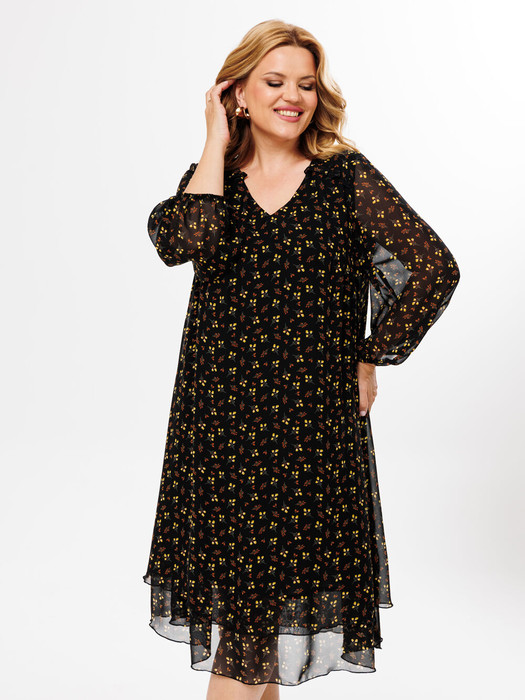 Нарядное шифоновое платье в романтический цветочек. Платье А-силуэта, длина ниже колен, с V-образным вырезом горловины, нижний волан пришить к трикотажной подкладке. Рукав 7/8 низ выполнен на резинке. Отличный вариант для прогулок и на работу. Длина платья - 112 см, длина рукава 56 см.