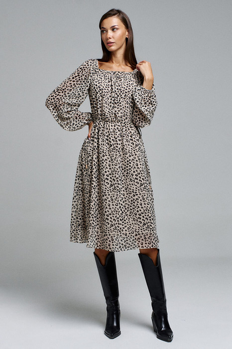 Платье шифоновое А-образного силуэта. Рукав длинный вверху и внизу на резинке. Горловина обработана планкой с резинкой. На талии кулиса с завязками по бокам. Платье на подкладке.