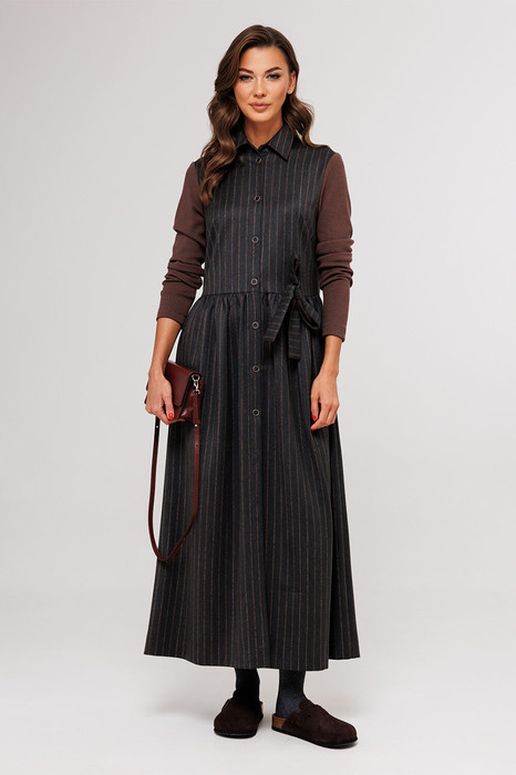 Платье длинное из костюмной ткани с втачным длинным одношовным трикотажным рукавом. Полочка с центральной застежкой на петли пуговицы и с нагрудными вытачками. По спинке нашивка "BUTER". Платье отрезное по линии талии и со сборкой по шву притачивания низа. Воротник рубашечный отложной на стойке. По линии талии бант из основной ткани. Платье без подкладки.