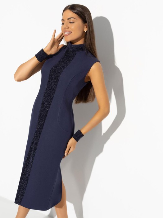 Раньше ты думала, что смелость – это прыгнуть с парашютом, покорить Эверест или нырнуть с аквалангом. Позже тебе раскрылась другая смелость. Смелость быть роскошной. Не все к этому готовы, но если ты чувствуешь порыв – выбирай платье от CHARUTTI. Платье в длине миди приталенного силуэта. Воротник-стойка. Центральная линия из акцентного материала с блеском. Платье застегивается на скрытую молнию по спинке изделия. Есть разрез сзади по шву. Съемные манжеты в комплекте.