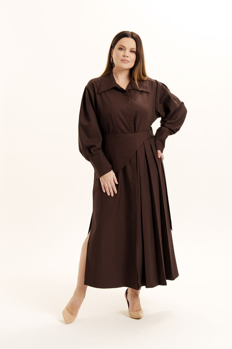 Платье женское приталенного силуэта из костюмной ткани. Вырез горловины оформлен воротником рубашечного типа. Застежка - потайная на петли с пуговицами. Рукава - втачные с мягкой складкой в области оката. Низа посажены на отрезные манжеты с застежкой на петли с пуговицами. Отрезное по линии талии. В боковых швах имеются карманы. Справа выполнен разрез, слева - складки. Изделие декорировано съемной баской.