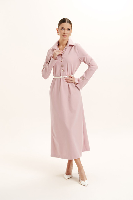 Платье прямого силуэта из мягкого трикотажа слегка расширенного к низу, с втачным одношовным рукавом на высокой манжете с застежкой на петлю и пуговицу. Воротник рубашечного типа с отрезной стойкой. По переду обработана застежка - планка на петли и декоративные пуговицы. Спинка со средним швом. В боковых швах обработаны карманы. В комплект входит съемный пояс.