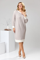 Платье женское  полуприлегающего силуэта .Спинка со средним швом и разрезом по низу.Перед с кокеткой  и подрезом чуть ниже талии ,в котором обработаны карманы с молнией. По центру переда лампас из отделочной  ткани с вышивкой .Рукав втачной  со спущенной линией плеча состоит из трёх частей: средняя часть рукава и средняя часть переда  из отделочной ткани (кож.зам.),нижняя деталь рукава с двумя вытачками.Горловина округлая .По плечевым швам настрочена отделочная тесьма.