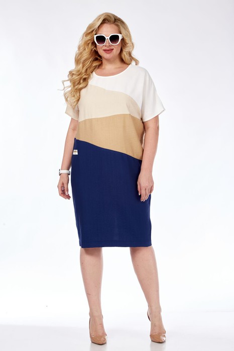 Платье женское свободного кроя чуть зауженное к низу. Платье выполнено из ткани четырёх разных оттенков. Перед с тремя косыми подрезами. Спинка с тремя подрезами и средним швом в нижней части , в котором обработан разрез.Рукав цельнокроеный. Горловина округлой формы. В качестве отделки используется нашивка.