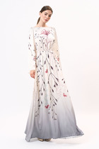 Платье женское длиной до середины икры, слегка расклешенное к низу. Спинка с косым передом в области талии и средним швом до разреза. Перед с косым подрезом в области талии, образующий мягкую складку из лифа и 1 глубокую складку от подреза вниз. Горловина с рубашечным воротником на стойке и драпировкой в виде качели. Рукав втачной с отложными манжетами.