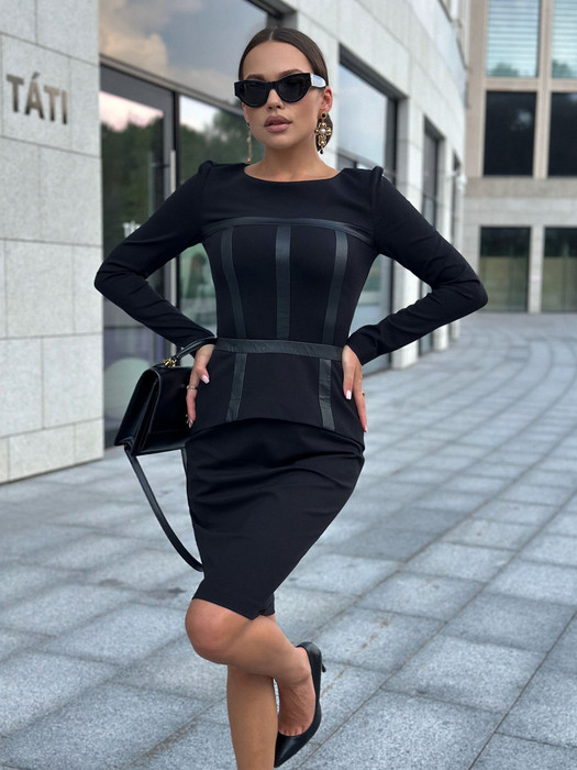 Платье женское прилегающего силуэта с застежкой на потайную тесьму-молнию в верхней части среднего шва спинки. Платье выполнено из трикотажа и искусственной кожи.