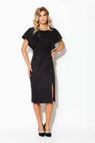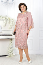 Платье женское полуприлегающего силуэта, из плательно-костюмной ткани. Деталь переда асимметричная. Левая часть переда со смещённым рельефом и нагрудной вытачкой переходящей в талевую вытачку. Правая часть отлетная, со смещённым рельефом и нагрудной вытачкой. Ниже уровня талии нашит обтачной клапан. Застёжка на уровне талии хлястиками с фиксацией на залотые рамки и 2-е кнопки. Воротник пиджачного типа, с цельнокроенными лацканами, воротник стояче-отложной с прямыми углами. Спинка с талевыми вытачками, в среднем шве обработана шлица. Рукава втачные, одношовные, длинные. В левом боковом шве обработана застёжка на потайную тесьму молнию.