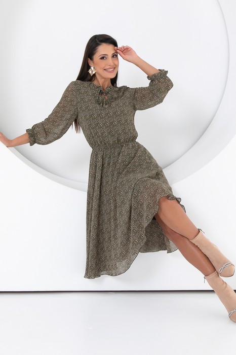 Летящее шифоновое платье подчёркивает достоинства вашей фигуры, делает Ваш образ женственным и нежным. Юбка платья полусолнце отрезная по линии талии. Полупрозрачные втачные рукава длиной 3/4 с низу подогнуты и сосборены на резинку. Платье с подкладом,притачным по горловине и пройме.По талии платье присборено на шпульную резину. Модель выполнена из шифона и трикотажного подклада.