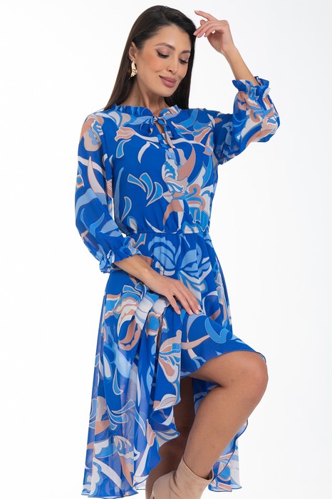 Летящее шифоновое платье подчёркивает достоинства вашей фигуры, делает Ваш образ женственным и нежным. Юбка платья полусолнце отрезная по линии талии. Полупрозрачные втачные рукава длиной 3/4 с низу подогнуты и сосборены на резинку. Платье с подкладом,притачным по горловине и пройме.По талии платье присборено на шпульную резину. Модель выполнена из шифона и трикотажного подклада.