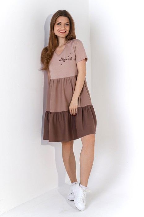 Платье из гладкокрашеного трикотажного полотна «кулирка» в комбинации трех контрастных цветов, отрезное чуть выше линии талии, с короткими втачными рукавами, горловиной v – образной формы, окантованной материалом лифа. Юбка состоит из двух ярусов, выполненных из полотна разных цветов и присборенных по швам стачивания друг с другом и лифом. На полочке слева – вышивка.