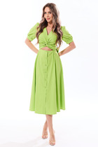 Платье женское на подкладке, А-силуэта, длина мини. На спинке и переде воланы в 4 яруса. Горловина- стойка, застегивается на 3 навесные петли и пуговицы. На спинке перекрестные бретели.