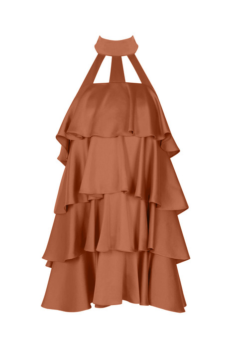 Платье женское на подкладке, А-силуэта, длина мини. На спинке и переде воланы в 4 яруса. Горловина- стойка, застегивается на 3 навесные петли и пуговицы. На спинке перекрестные бретели.