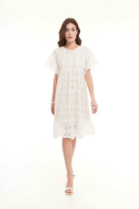 Платье свободного силуэта, с втачными короткими рукавами. Застежка обработана планками, с круглыми петлями. По низу изделия сделана сборка.