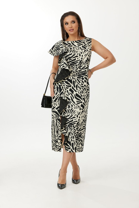 Платье женское, прямого силуэта. Вырез горловины по переду - "лодочка", по спинке V - образный. По переду рельеф, заканчивающийся разрезом, и волан, переходящий в горловину спинки. Волан обтачен тканью-компаньоном. В боковых швах карманы.
