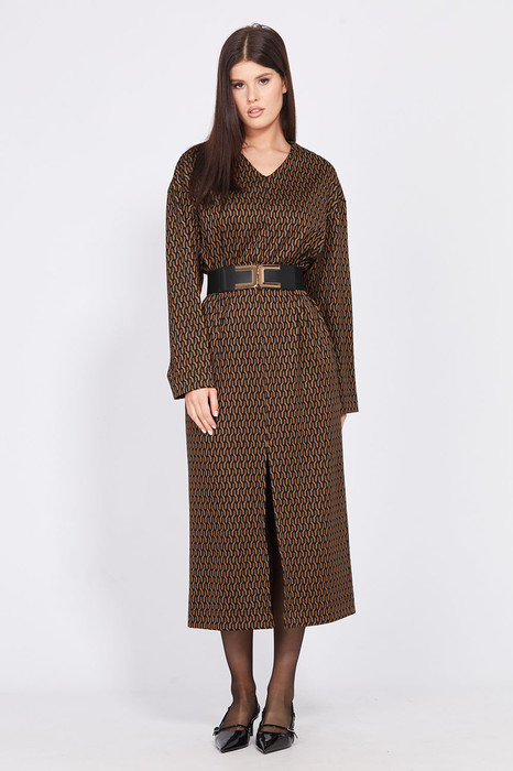 Платье выполнено из трикотажного полотна с геометрическим принтом. Платье прямого силуэта, длиной миди. Спинка цельная. Горловина V-образной формы. Плечевой шов спущен. Рукав рубашечного покроя, одношовный. В боковых швах карманы. Спереди в среднем шве разрез. В комплект входит съемный ремень из эластичной тесьмы с пряжкой.