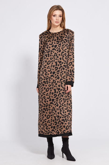 Платье выполнено из атласа с анималистичным принтом. Платье прямого силуэта длиной миди. Перед цельный. Спинка со средним швом в котором обработан разрез и застежка на потайную молнию. Горловина округлой формы. Рукав втачного покроя, одношовный. Платье на отлетной по низу подкладке. Низ платья и низ рукава декорированы нижним отлетным слоем из однотонной ткани. Платье с плечевыми накладками.