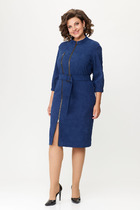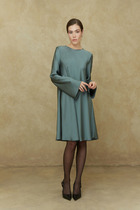 Платье выполнено из плательной ткани. Платье А-образного силуэта, длиной выше линии колена, отрезное под грудью. Горловина переда V-образной формы. Горловина спинки горизонтальной формы. Рукав покроя полуреглан со сборкой и эластичной тесьмой по окату, длиной чуть ниже линии локтя. Рукав расширен к низу, присборен и обработан эластичной тесьмой. Юбка расширена к низу. В боковых швах карманы. В левом боковом шве застежка на потайную молнию. Платье на отлетной по низу подкладке с декоративным кружевом.