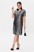 Платье выполнено из плательной ткани. Платье Х-образного силуэта. Центральная часть спинки собрана на венгерку. Рукав длиной до линии локтя, одношовный, расширенный. Верх и низ рукава обработаны эластичной тесьмой. Юбка расширена к низу. В боковых швах обработаны карманы. Юбка настрочена на лиф. Лиф платья на подкладке.