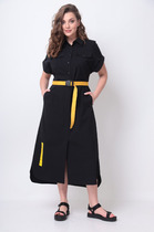 Платье выполнено из плательной ткани. Платье Х-образного силуэта. Центральная часть спинки собрана на венгерку. Рукав длиной до линии локтя, одношовный, расширенный. Верх и низ рукава обработаны эластичной тесьмой. Юбка расширена к низу. В боковых швах обработаны карманы. Юбка настрочена на лиф. Лиф платья на подкладке.