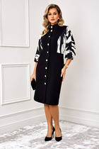 Платье выполнено из плательно-блузочной ткани в полоску. Платье прямого силуэта, длиной до линии щиколотки. По переду центральная застежка до верха с цельнокроеной планкой. На спинке обработаны кокетка и две складки от неё. Горловина округлой формы, обработана стояче-отложным воротником с отрезной стойкой. Плечевой шов удлинен. Рукав рубашечного покроя, одношовный, с двумя складками и обтачкой прорези по низу. Низ рукава обработан притачной манжетой, застегивающейся на две петли и пуговицы. В боковых швах обработаны карманы и разрезы.