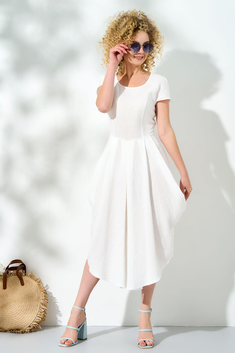 Платье женское выполнено из тонкого хлопка "муслин" изделие приталенного кроя. Отрезное по линии талии. По полочке изделия расположен рельефы.  Горловина -округлая. Застежка потайная молния по спинке. По юбке заложены глубокие складки. По центральному шву юбки имеется вырез. Платье без подкладки.