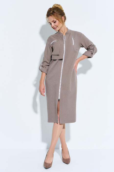 Платье женское приталенного кроя выполнено из тканей-компаньонов. По полочке платья расположена декоративная кокетка с молнией. Застежка разъемная молния по переду. Рукав-втачной длинный с патой. Горловина-стойка.