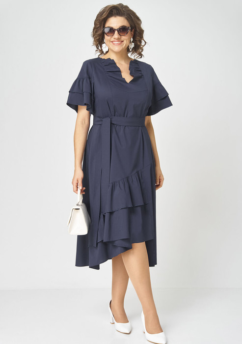 Платье стильное красивое женское нарядно повседневное полуприлегающего силуэта отрезное по талии и расширенное к низу. Выполнено из однотонного тхлопка. Вырез горловины фигурный стильный со сборкой, что является трендом этого сезона. Рукав втачной короткий по низу с двойным притачным воланом, что придает легкости изделию. Платье отрезное по талии, по передней полочке ассиметричный притачной волан, очень эксклюзивная деталь в общем стиле изделия.
