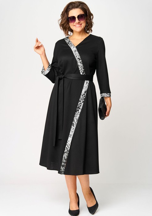 Платье женское повседневное полуприлегающего силуэта вполнено из трикотажного полотна в сочетании с отделкой. Вырез горловины V-образный на обтачке. Рукав втачной 7/8 по низу на пританой манжете из отделоной ткани. По переду патье с выточками и отрезными ассиметричными элементами из отделочной ткани. По центру платья обработан небольшо разрез. Декором платья служит съемный пояс из основной ткани.