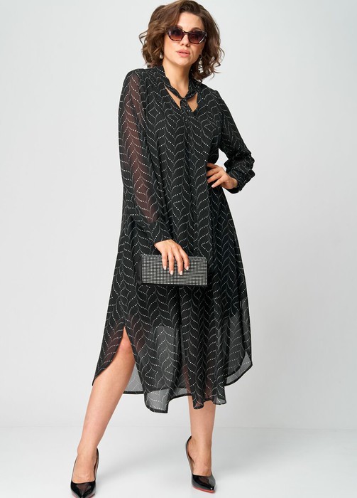 Платье женское нарядно-повседневное полуприлегающего силуэта до талии расширенное к низу. Плье отрезное по талии. Выполнено из креп-шифона. Вырез горловины отложной воротник с подбортами, до талии застежка на обметанные петли и пуговицы. Рукав втачной по низу собран на резинку. от талии юбка платья на трикотажной подкладке. Декором платья служит съемный пояс и принт самой ткани.