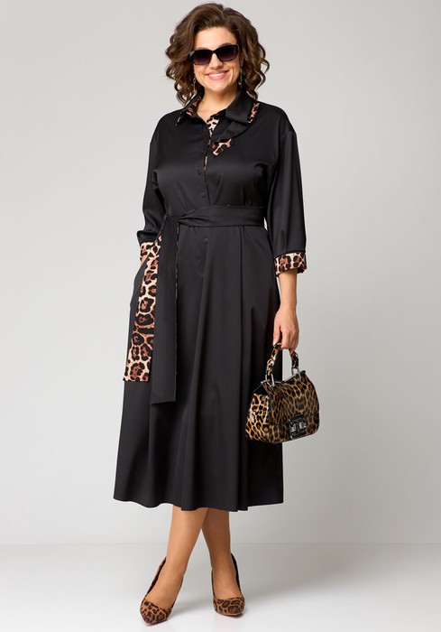 Платье женское нарядно-повседневное полуприлегающего силуэта расширенное к низу выполнено из плательной ткани в сочетании с отделкой с анималистичным принтом. Вырез горловины ассиметричный воротник на стойке рубашечного типа с левой сороны переходящий в отделочный элемент закрепленный на верхней части полочки. По центру застежка ниже талии на обметанные петли и пуговицы. Плечо спущенное, рукав втаной по низу со складками на притачной манжете. В боковых швах обработаны карманы. Декором служит съемный пояс с отделкой.