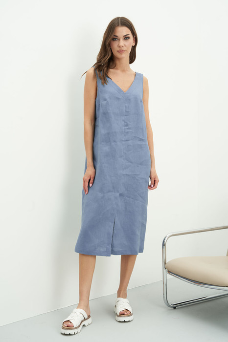 Свободный упрямлённый силуэт, без рукава, изящный V-образный вырез, нагрудная вытачка, карманы в боковых швах с настрочной фигурной мешковиной. По центру переда кокетливый разрез. Спинка с центральным швом.