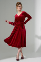 По боковым швам - разрезы. Все конструктивные элементы платья подчёркнуты контрастными отделочными строчками.