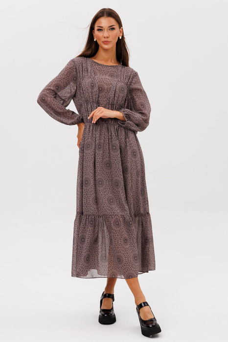 Легкое и воздушное, микс нежности и дерзости, воплощенный в комбинации противоположностей: нежного шифона и геометрического принта. А-образный силуэт, втачной рукав, со сборкой по низу, круглая горловина. Платье отрезное, чуть выше линии талии, лиф полочки с V-образным подрезом и легкой сборкой в боковой части на эластичную венгерку. Боковая часть на подкладке. Лиф спинки со средним швом и застежкой. По линии талии-эластичная тесьма.
