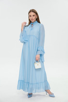 Модель выполнена в прилегающем силуэте, который подчёркивает линии фигуры, оставаясь при этом максимально деликатным и утончённым. Сложное конструктивное решение превращает платье в настоящий объект дизайна: