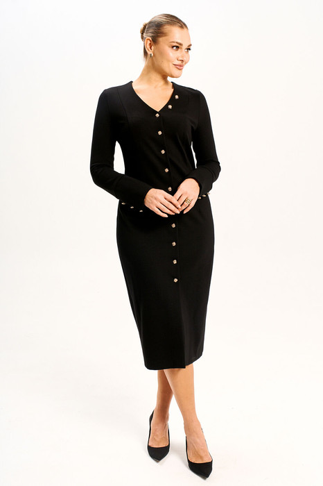 Платье полуприлегающего силуэта выполнено из трикотажного полотна средней плотности. По переду изделия рельефы; рукава втачные с высокой  притачной манжетой; вырез горловины v - образной формы; застежка по переду на петли и декоративные пуговицы. Платье полностью соответствует заявленному размеру.
