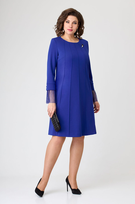 Платье женское А- образного силуэта выполнено из трикотажного крепа с мелким блеском. По переду платья расположены пять отделочных защипов, которую зрительно вытягивают фигуру. Рукав втачной одношовный, низ которого оформлен манжетой с пуговицами и сеточкой. Спинка со средним швом и потайной молнией вверху. Отделкой платья служит декоравная брошь.