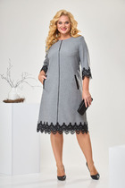 Платье женское полуприлегающего силуэта из тонкого джинса, длиной до середины колена. Свойства ткани позволяют расположить на изделии детали чётких форм: паты(по плечевому шву), декоратные клапаны(на нижней части переда), а также расположить втачную декоративную молнию в верхней части переда. Рукав платья короткий втачной, по центру переда-потайная застежка на петли и пуговицы, горловина оформлена воротником-стойкой, борт образует отложные лацканы. Клапаны и паты украшены металлическими пуговицами. Платье дополняют съёмный пояс и декоративные строчки
