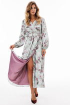 Платье женское слегка расклешённое к низу, льняное. На переде расположена декоративная печать. Нагрудная вытачка идёт с боковых швов. На правой половине расположен накладной карман. Спинка со средним швом, в котором расположена застёжка горловины на одну пуговицу. Горловина круглой формы. По боковым швам имеются разрезы. Рукава короткие, одношовные.