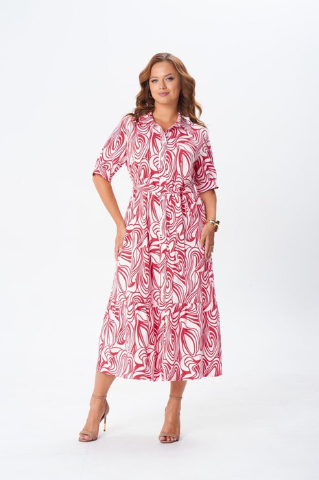 Платье А-образного силуэта выполнено из вискозной ткани с летним принтом. Платье с рубашечным воротником и центральной застежкой на петли и пуговиц. Перед с нагрудной вытачкой. Рукав втачной одношовный с притачной манжетой на петлю и пуговицу. По линии притачивания - сборка. По низу платья притачан волан со сборкой. К платью прилагается съемный пояс из основной ткани. Длина платья по спинке- 127 см, длина рукава- 29 см.