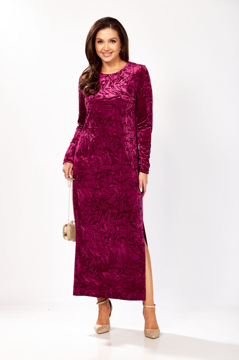Платье прямого силуэта из бархата. В боковом шве разрез. Рукав втачной одношовный. По спинке застежка капелька на петлю и пуговицу. Длина платья - 136 см, длина рукава - 66 см.