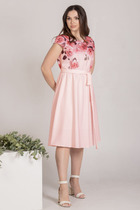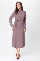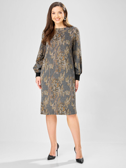 Платье прямого силуэта из плотного трикотажного полотна с рисунком и с люрексом. Перед с нагрудными вытачками. Спинка со средним швом. Горловина лодочкой обработана планкой. Рукав одношовный втачной по низу со складками собранными на манжету. Длина платья-100см, длина рукава-60см.