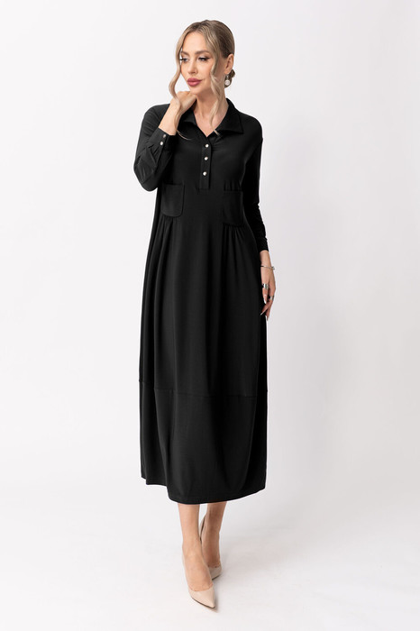 Платье с центральной застежкой на петли и пуговицы на планке переда, воротником-стойкой. Перед с двумя накладными карманами, расположенными ниже линии груди, сборкой под карманами. Спинка со средним швом, сборкой и патой на уровне линии талии.
