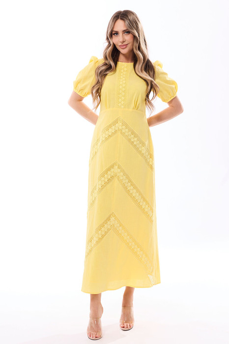 Платье, с застежкой на потайную молнию в среднем шве спинки, без воротника, с круглым вырезом горловины. Платье отрезное по линии талии. Лиф переда частично присборен по талиевому шву. По центру лифа переда настрочена деталь из кружева. Лиф спинки со средним швом, талиевыми вытачками. Нижняя часть переда платья со средним швом, втачными деталями из кружева. Нижняя часть спинки со средним швом, талиевыми вытачками. Рукав втачной, короткий, с отрезной манжетой. Окат и низ рукава присборен.