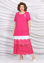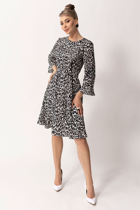 Платье расширенного к низу силуэта, с застежкой на потайную молнию в среднем шве спинки, без воротника, с круглым вырезом горовины. По переду с нагрудными вытачками. Спинка со средним швом. По низу платья- волан. Рукав втачной, 3/4, с отрезной манжетой- воланом. Платье со съемным поясом.